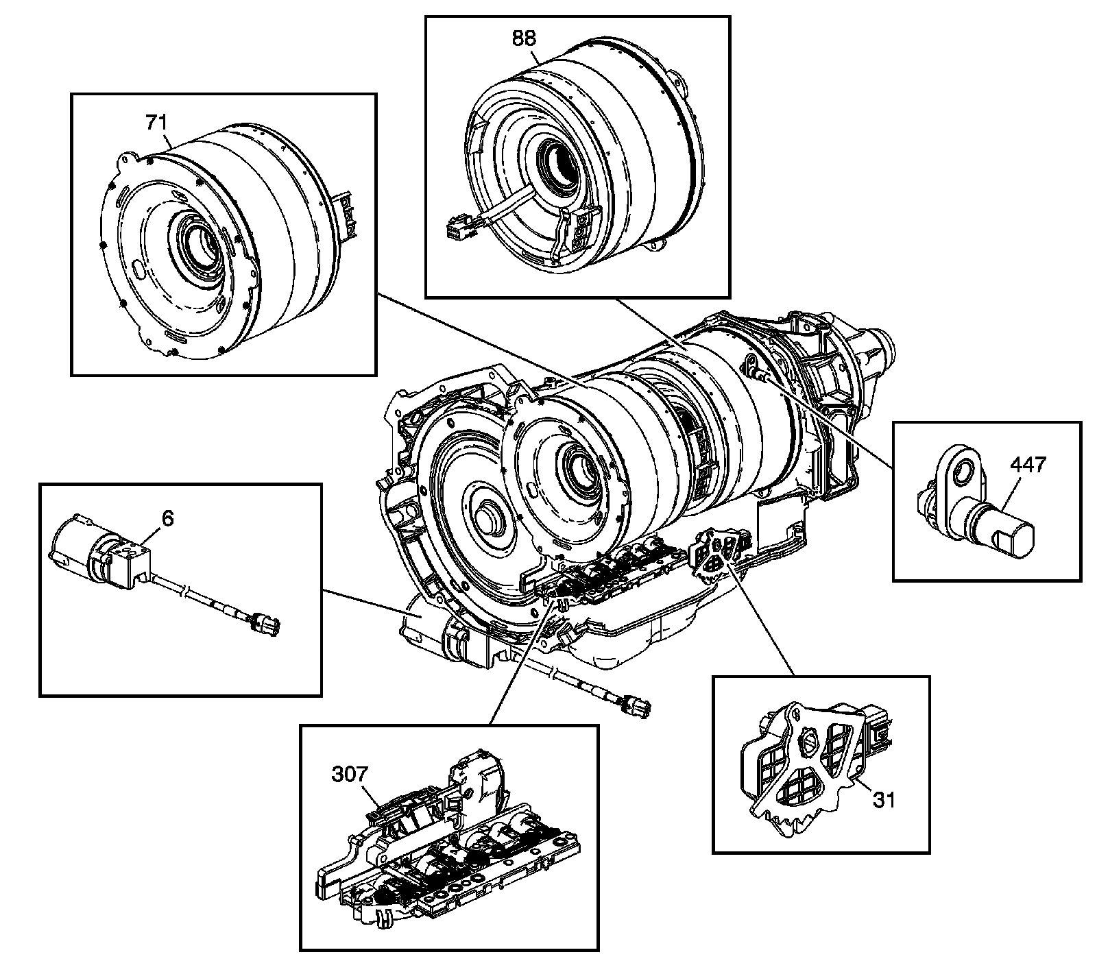 The output speed sensor assembly has 2 internal hall-effect type sensors, and is capable of sensing both speed and direction. The output speed sensor mounts to the A/T rear case assembly and is connected to the control solenoid valve assembly through a wire harness and connector. The sensor faces the hybrid direct, 2-3-4 clutch housing assembly machined teeth surface. The sensor receives 8.3-9.3 volts on the OSS supply voltage circuit from the transmission control module (TCM). As the output shaft rotates, the sensor produces a signal frequency based on the machined surface of the output shaft.