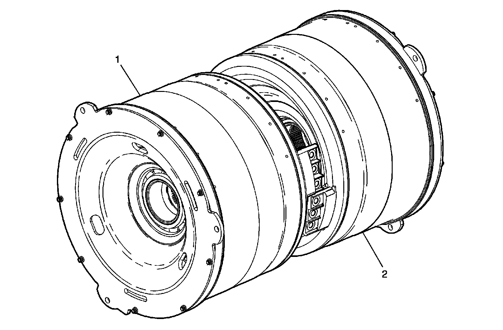 Two permanent magnet electric motors mounted inside the transmission enable engine cranking, transmission reverse, and two EV modes of operation. The front, or motor 1 and the rear, or motor 2 each provide 60kW peak power. Both are actively cooled via transmission fluid and are encased in steel housings to facilitate transmission assembly. The front motor is used to start the engine and also react torque from the rear motor. The rear motor propels the vehicle when operating in full-electric mode with the engine off or in reverse. Motor speeds are controlled and monitored by position sensors internal to the motor housings. The drive motor generator position sensor is monitored by the motor control module. The motor control module monitors the angular position, speed and direction of the drive motor generator based upon the signals of the resolver-type position sensor. The position sensor, or resolver, contains a drive coil, two driven coils and an irregular shaped metallic rotor. The metallic rotor is mechanically attached to the shaft of the drive motor generator. At ignition ON, the motor control module outputs a 5 volt ac, 10 kHz excitation signal to the drive coil. The drive coil excitation signal creates a magnetic field surrounding the two driven coils and the irregular shaped rotor. The motor control module then monitors the two driven coil circuits for a return signal. The position of the irregular shaped metallic rotor causes the magnetically-induced return signals of the driven coils to vary in size and shape. A comparison of the two driven coils signals allows the motor control module to determine the exact angle, speed and direction of the drive motor generator. For more information on the drive motor function and system interaction refer to Drive Motor Generator Control Module Description and Operation and Drive Motor Battery System Description .