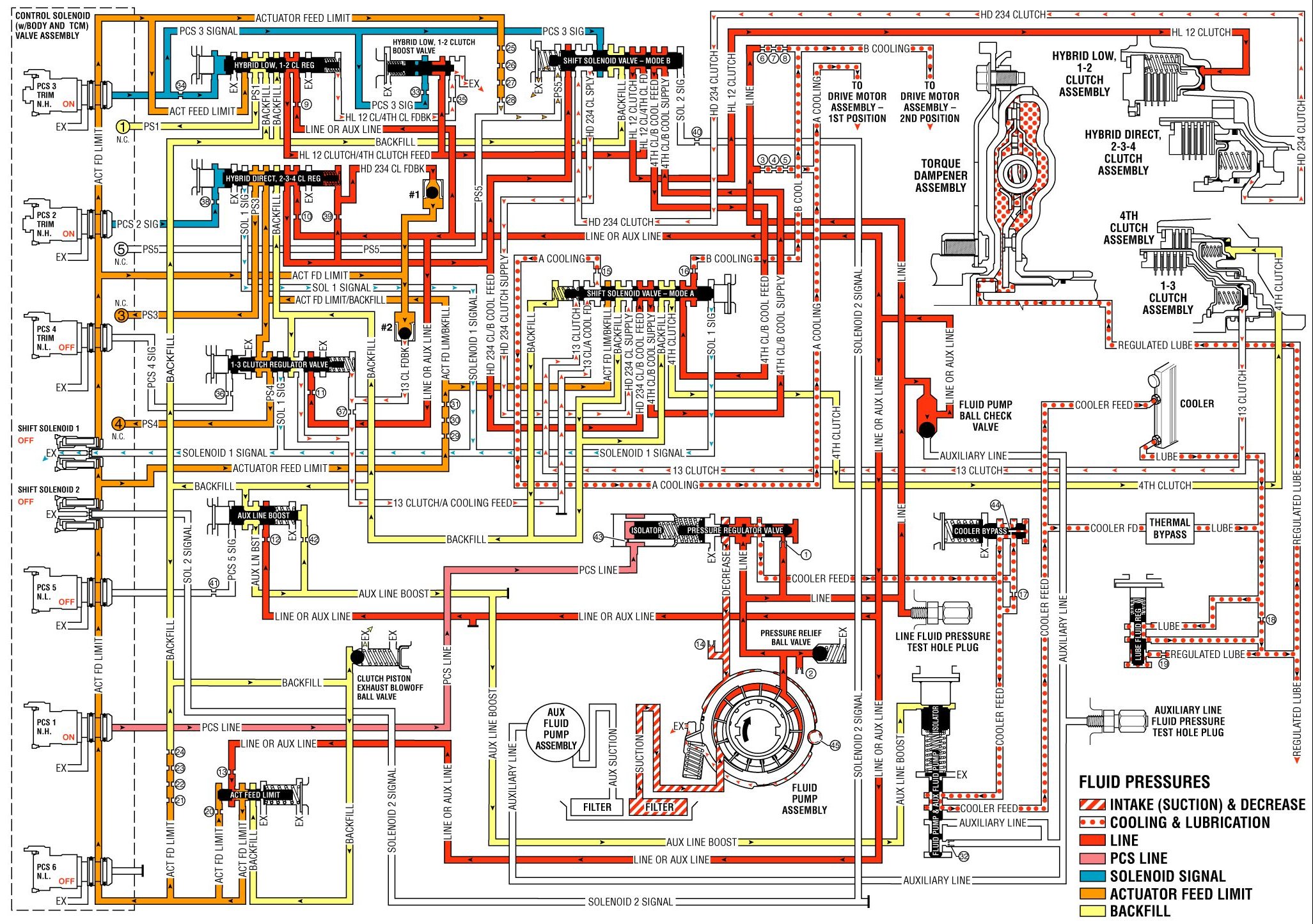 If the transmission is operating in Second gear when an electrical malfunction occurs, the shift solenoid 1 defaults to its normally closed state (OFF) and the hybrid direct, 2-3-4 clutch is released.