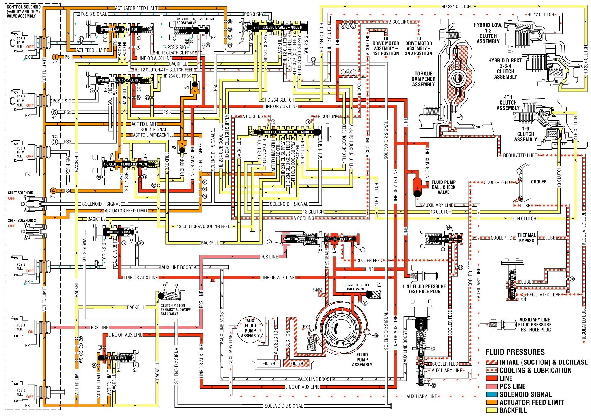 HL 12 clutch fluid passes through the shift solenoid valve - mode B and into the HL 12 clutch/4th clutch feed fluid circuit and is routed to the hybrid low, 1-2 clutch regulator valve.