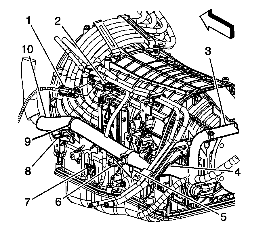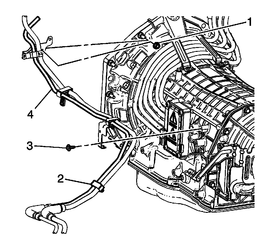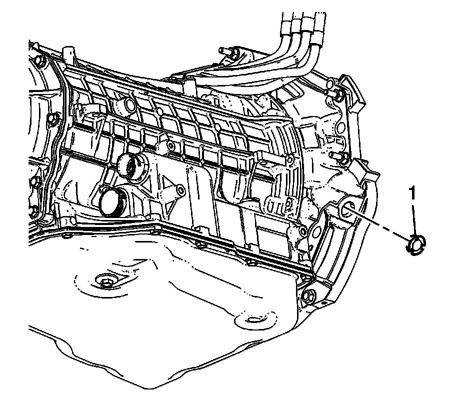 49. Remove the transmission oil cooler pipes (1) from the transmission. Refer to Transmission Fluid Cooler Pipe Replacement Transmission Fluid Cooler Pipe Replacement.
