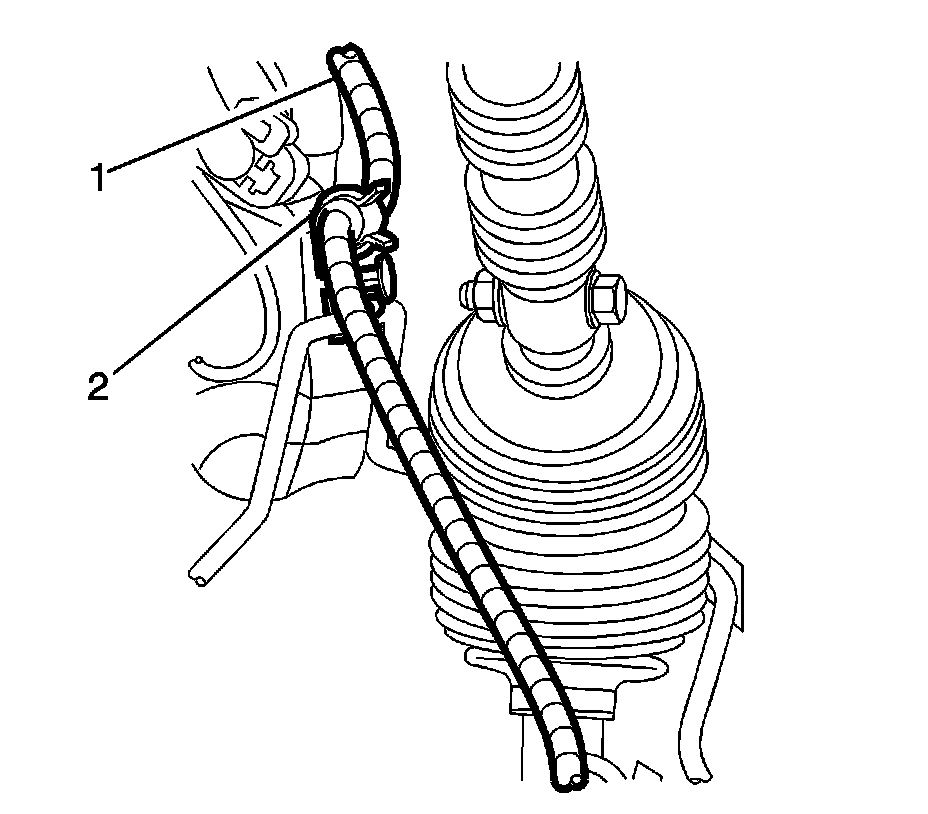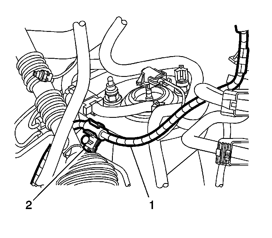 1. Install the vent hose (1) from the connector (2) at the shock tower