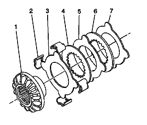 2. Remove the clutch discs and the splined discs (3-7) from the locking differential side gear (1).