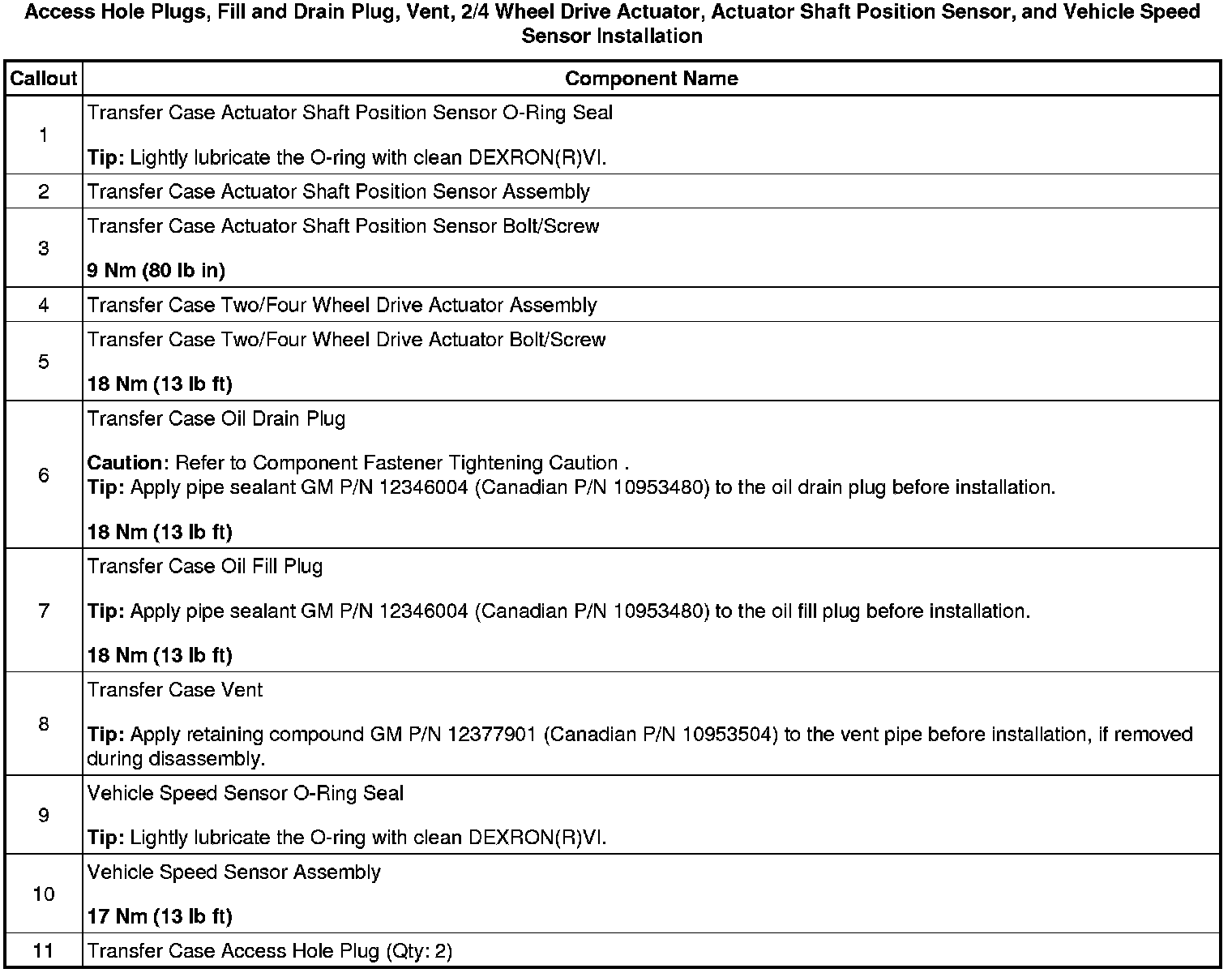 Access Hole Plugs, Fill and Drain Plug, Vent, 2/4 Wheel Drive Actuator, Actuator Shaft Position Sensor, and Vehicle Speed Sensor Installation