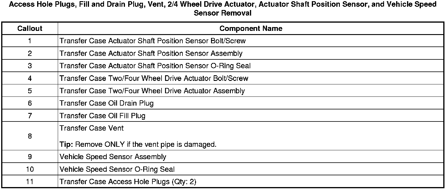 Access Hole Plugs, Fill and Drain Plug, Vent, 2/4 Wheel Drive Actuator, Actuator Shaft Position Sensor, and Vehicle Speed Sensor Removal