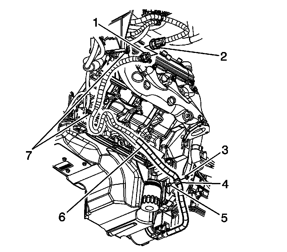 2. Disconnect the auxiliary fluid pump control module electrical connector (1) from the engine wiring harness electrical connector (2).