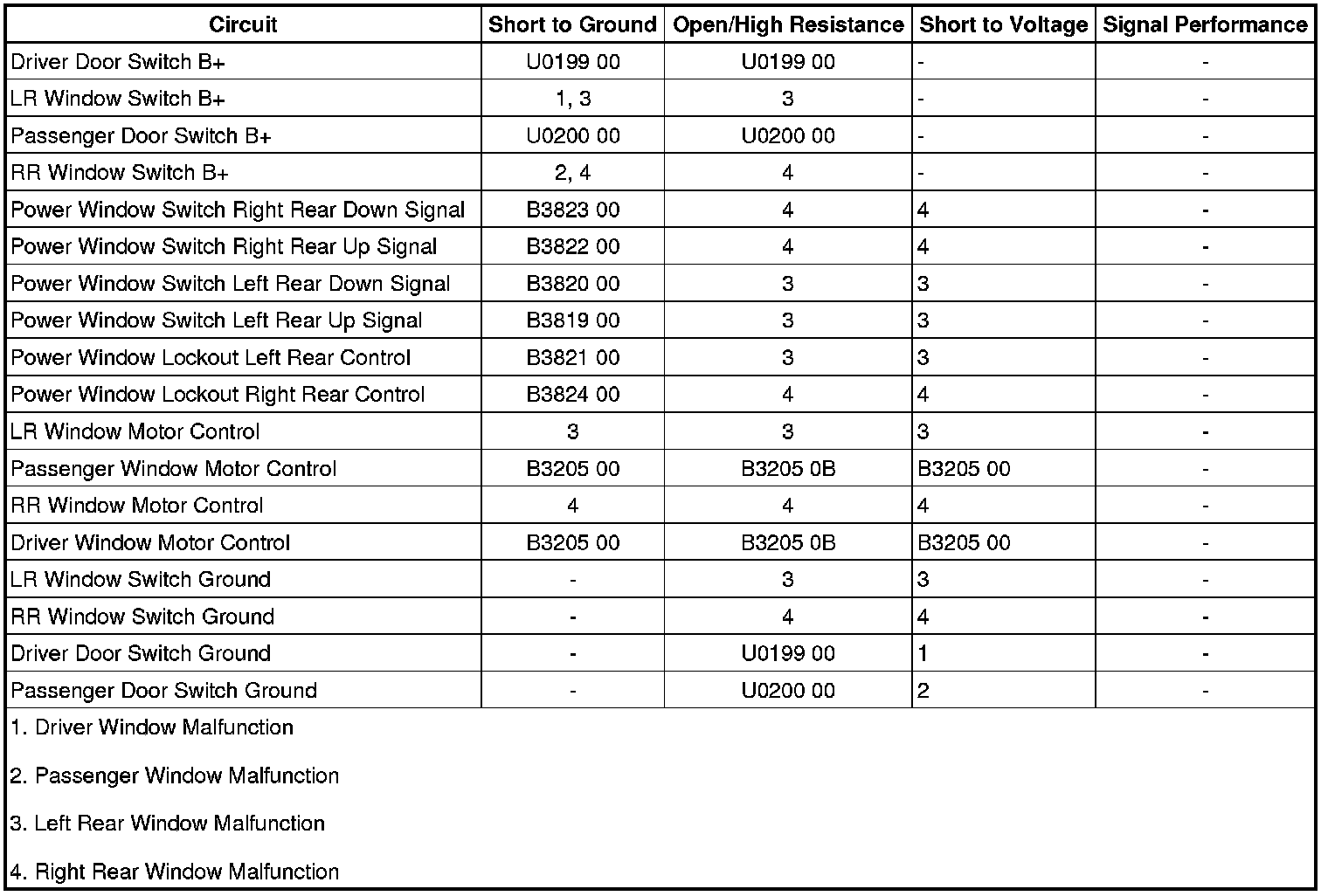 • If either rear passenger power window does not perform the UP or DOWN function, refer to Rear Passenger Window Malfunction.