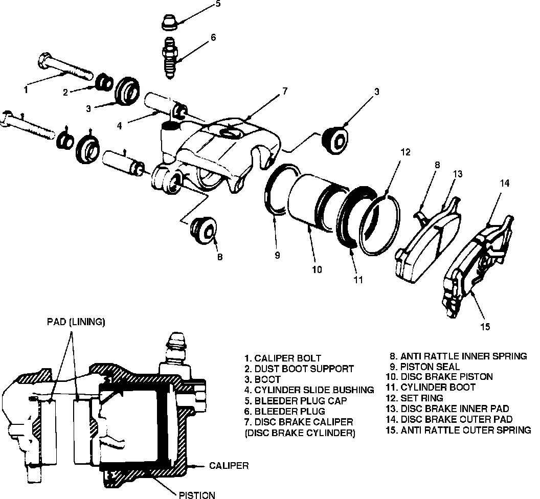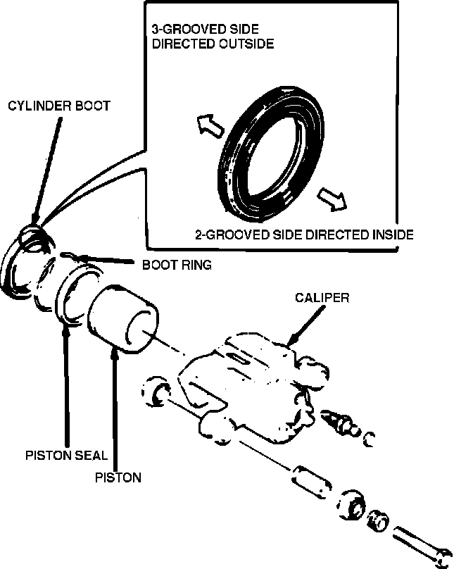 1. Remove caliper assembly as outlined previously, then drain brake fluid from caliper.