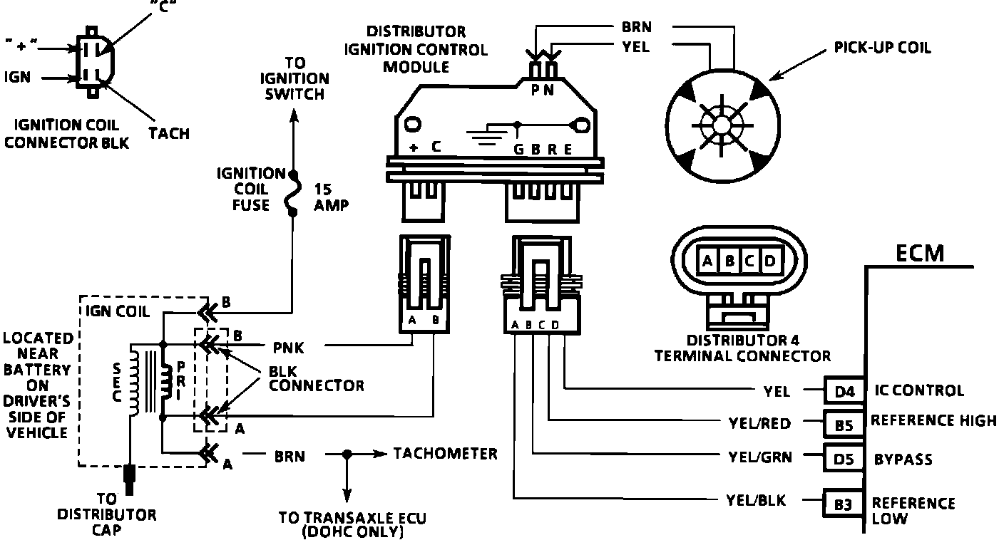A four-terminal connector is used for EST use, in addition to the connectors normally found on HEI distributors. All spark timing changes are controlled by the ECM, which monitors information from the various engine sensors, computes the correct spark timing, then signals the distributor to adjust the timing accordingly. The distributor operates without ECM control during cranking or when setting basic ignition timing. This is known as the "Bypass" mode and it is determined by the bypass lead from the ECM to the distributor. When the bypass lead voltage is approximately 5.0 volts, the ECM performs the spark timing function. However, when the bypass lead is grounded or open circuited, the HEI module assumes the spark control function. Disconnecting the four terminal EST connector causes the engine to automatically operate in the bypass mode. The EST connector should be disconnected whenever setting basic ignition timing.