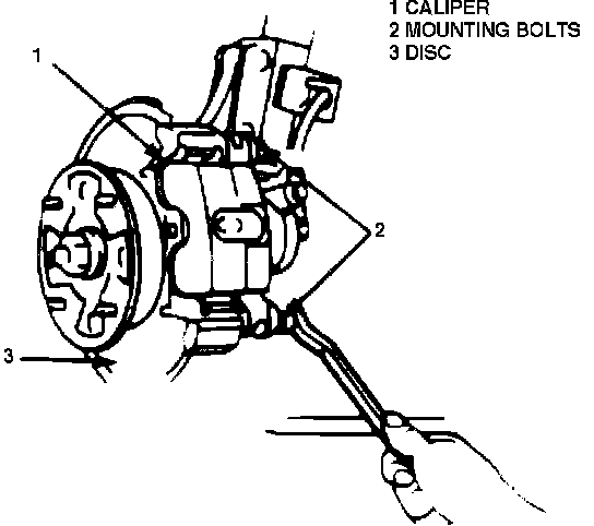 3. Remove caliper from knuckle, taking care not to drop inside pad. If only shoe and lining assemblies are to be replaced, suspend caliper from chassis using suitable hanger. Do not allow caliper to hang by brake hose.