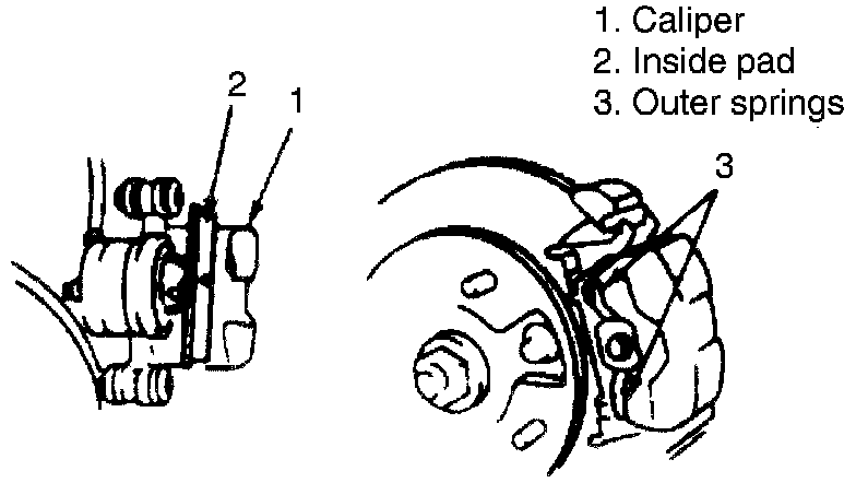 6. Install caliper and inside pad to knuckle, Fig. 4. Position outer springs over caliper as shown.