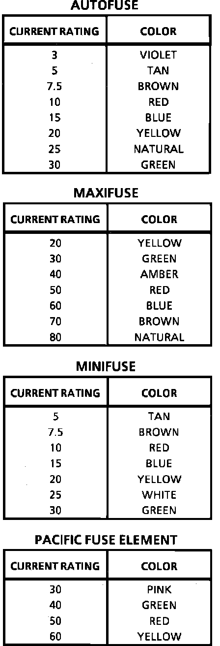 The most common method of automotive wiring circuit protection is the fuse, Fig. 1. A fuse is a device that, by the melting of its element, opens an electrical circuit when the current exceeds a given level for a sufficient time. The action is non-reversible and the fuse must be replaced each time a circuit is overloaded or after a malfunction is repaired. Fuses are color coded. The standardized color identification and ratings are shown in Fig. 2. For service replacement, non-color coded fuses of the same respective current rating can be used. Examine a suspect fuse for a break in the element. If the element is broken or melted, replace the fuse with one of equal current rating. There are additional specific circuits with in-line fuses. These fuses are located within the individual wiring harness and will appear to be an open circuit if blown.