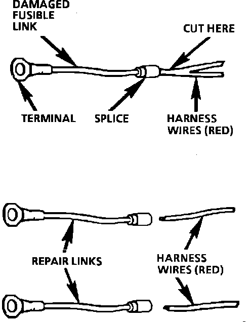 To replace a damaged fusible link which feeds two harness wires, cut them both off beyond the splice. Use two repair links, one spliced to each harness wire, Fig. 5.