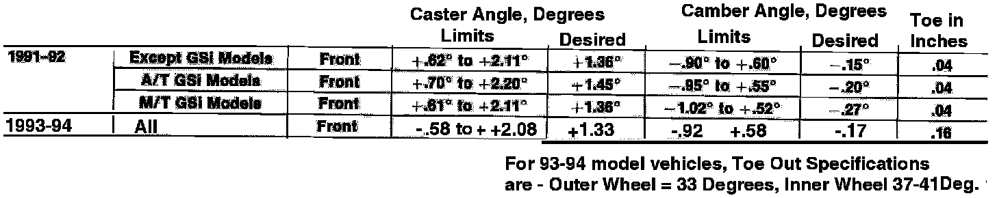 Front Wheel Alignment Specifications: