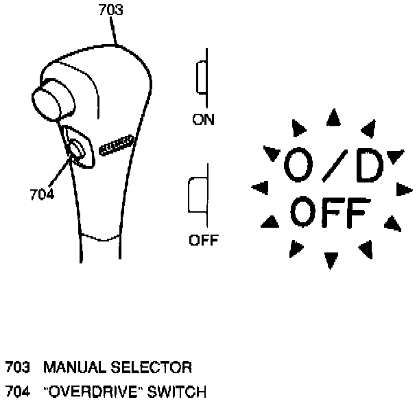 "O/D" - Overdrive ("D" position with "OVERDRIVE" switch depressed) is used for all normal driving conditions. It provides four gear ratios plus torque converter clutch (TCC) operation. Downshifts are available for safe passing by depressing the accelerator pedal.