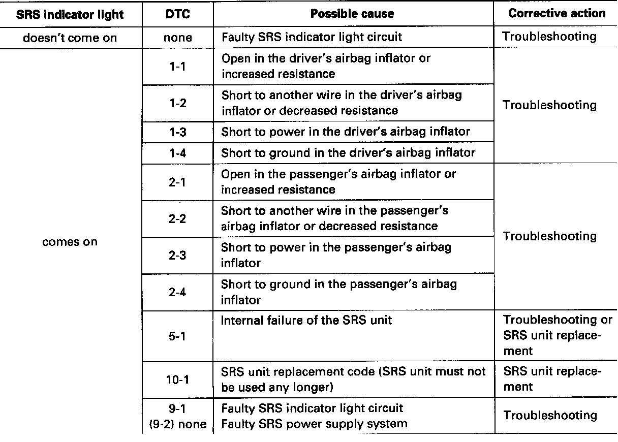 - If there occurs an intermittent failure in the SRS power supply, DTC 5-1 and DTC 9-2 are indicated. Erase the memory, and do the troubleshooting for intermittent failures. (See Self-Diagnostic Procedures).