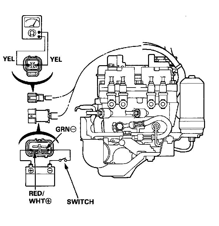 2. Attach the positive (+) lead of a fully charged 12 V battery to the RED/WHT terminal of the motor connector and negative (-) lead to the GRN terminal, and install a switch between negative lead and GRN terminal as shown.