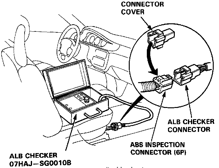 2. Disconnect the ABS inspection connector (6P) from the cross-member under the passenger's seat and connect the ABS inspection connector (6P) to the ALB checker.