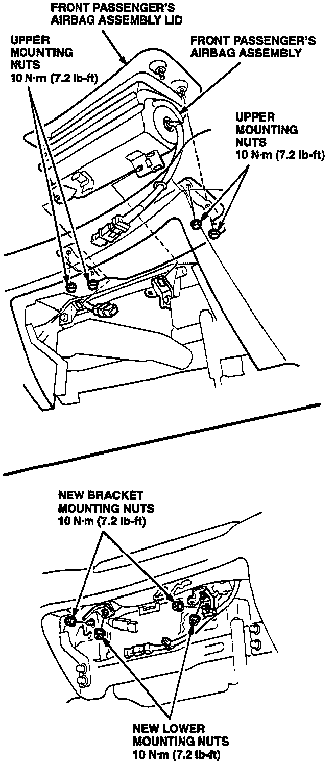 8. Reinstall the airbag in the dashboard. Replace the original bracket mounting nuts and the lower mounting nuts with new nuts from the kit. Use the original upper mounting nuts. Tighten the upper mounting nuts first, then tighten the lower mounting nuts and bracket nuts. Tighten all eight nuts to 10 N-m (7.2 lb-ft).
