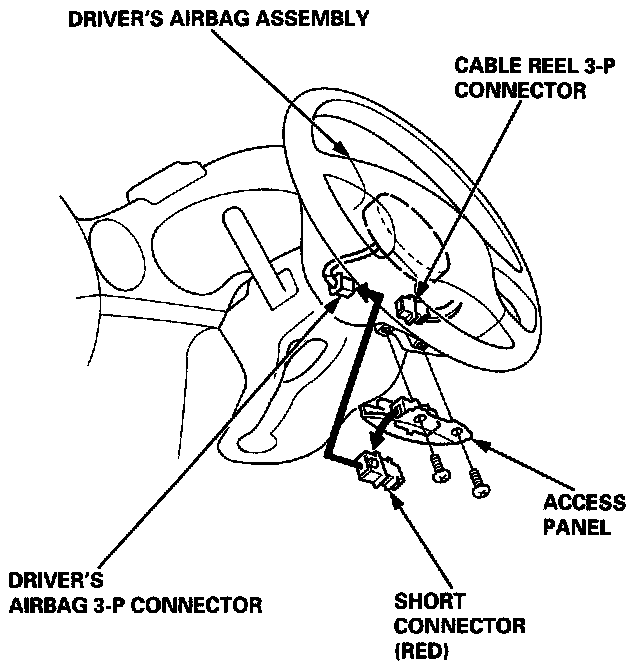 - Disconnect the 3-P connector between the driver's airbag and cable reel, then connect the short connector (RED) to the airbag side of the connector.