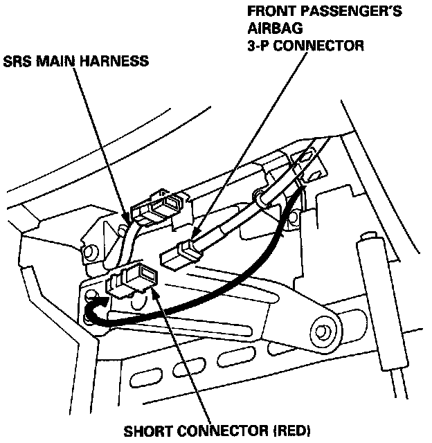 - Disconnect the 3-P connector between the front passenger's airbag and SRS main harness, then connect the short connector (RED) to the airbag side of the connector.
