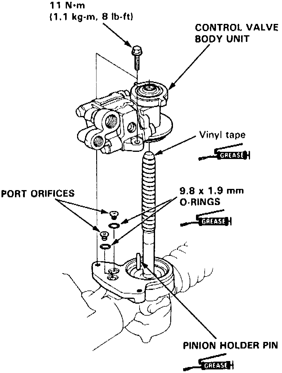 11. Coat O-rings and pinion holder pin with grease, then install with port orifices.