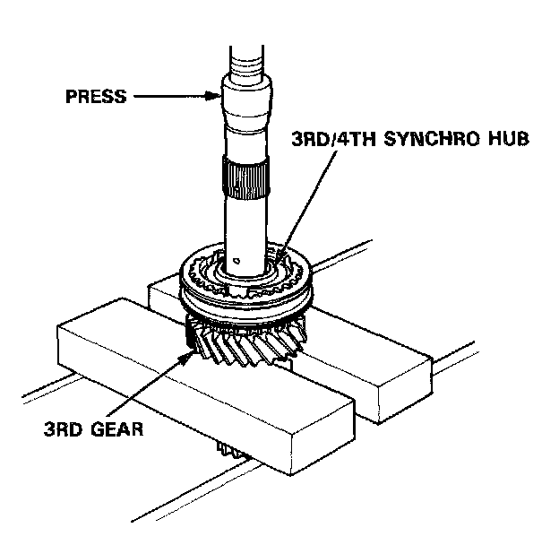 CAUTION: Remove the synchro hubs using a press and steel blocks as shown. Use of a jaw-type puller can cause damage to the gear teeth.
