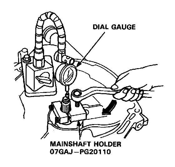 f. Turn the mainshaft holder bolt clockwise; stop turning when the dial gauge has reached its maximum movement. The reading on the dial gauge is the amount of mainshaft end play.