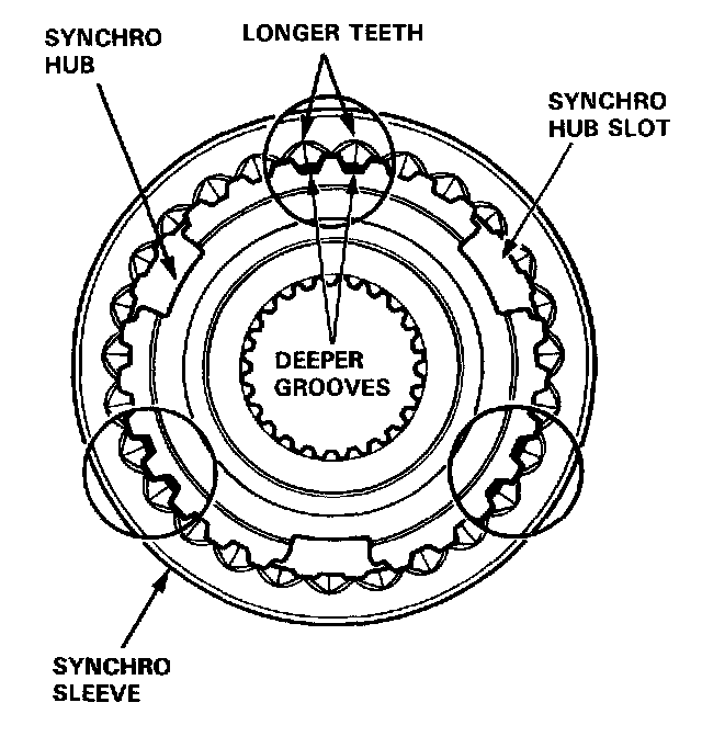INSTALLATIONEach synchro sleeve has three sets of longer teeth (120 degrees apart) that must be matched with the three sets of deeper grooves in the hub when assembled.