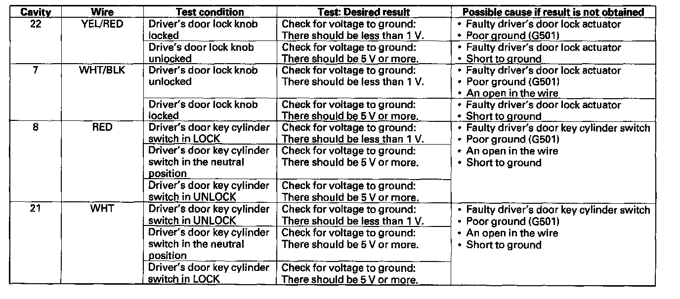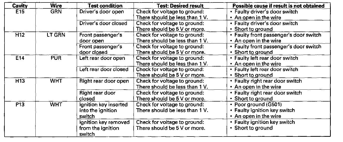 11. Reconnect the connector to the door multiplex control unit, and make these input tests at the appropriate connector.