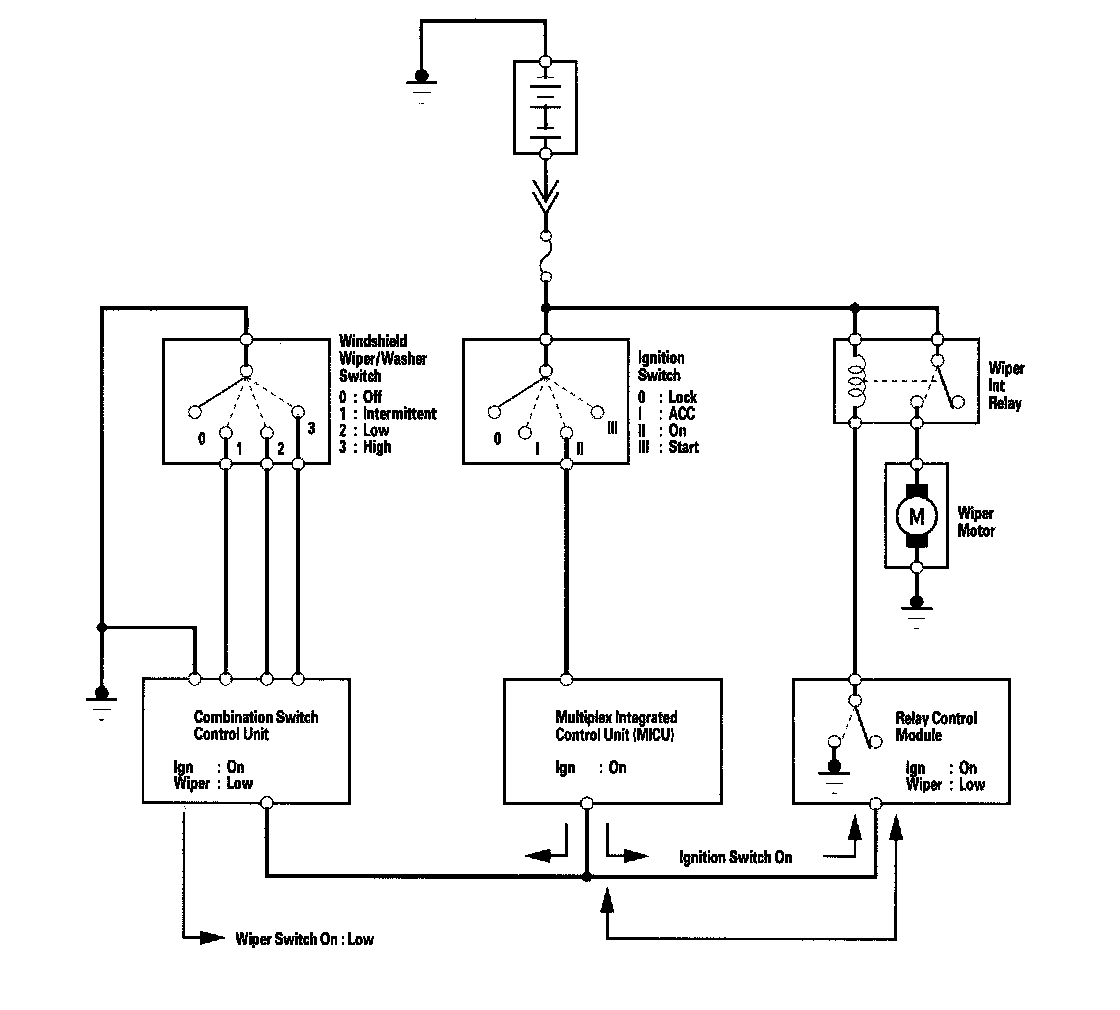 Messages are transmitted by an ECU (that monitors an input) over the communication circuit. ECUs that use the message (information related to that input) are the receivers. For example, the Combination Switch Control Unit monitors the wiper switch. When the wiper switch is placed in the low speed position, the Combination Switch Control Unit transmits that message on the communication circuit. The Relay Control Module receives the message and turns on the wipers by providing a ground for the relay.