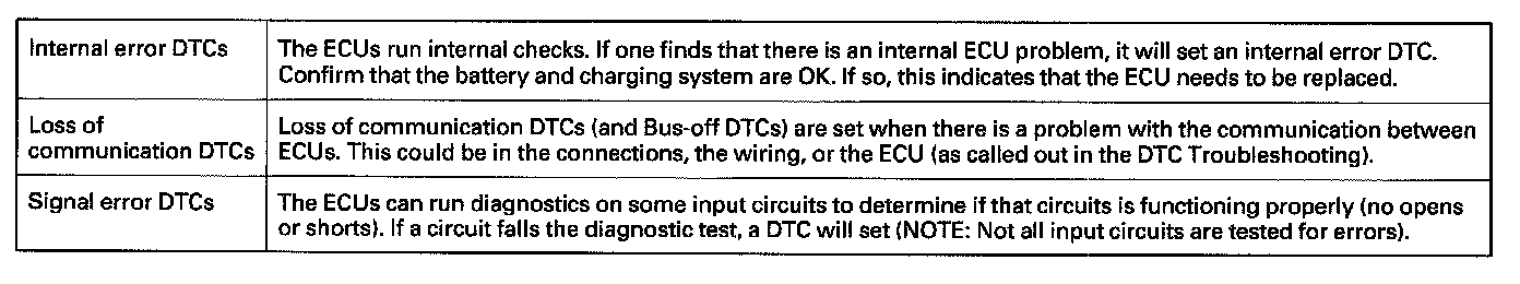 The B-CAN and F-CAN systems send messages to each other to check the integrity of the network communication circuit. They do this by sending a specific digital message out after an event. For example, turning the ignition switch to ON. After the switch to ON, all the ECUs on the communication circuit expect to receive a message from other specific units within a specified amount of time. If the message is not received, the ECU will transmit a DTC reporting that the control units did not communicate.