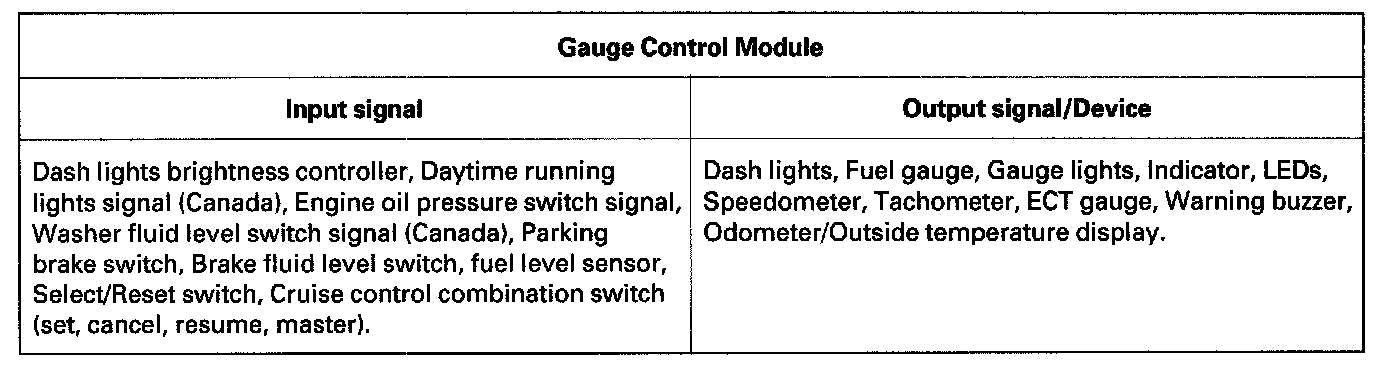 Fast controller Area Network (F-CAN) and Body Controller Area Network (B-CAN) share information between multiple Electronic Control Units (ECUs). B-CAN communication moves at a slower speed for convenience related items, and for other functions. F-CAN information moves at a faster speed for "real time" functions such as fuel and emissions data. To allow both systems to share information, the Gauge Control Module translates information from B-CAN to F-CAN and from F-CAN to B-CAN.