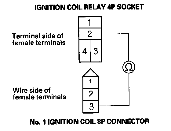 4. Check for continuity between ignition coil relay 4P socket terminal No. 2 and the No. 1 ignition coil 3P connector terminal No. 3.