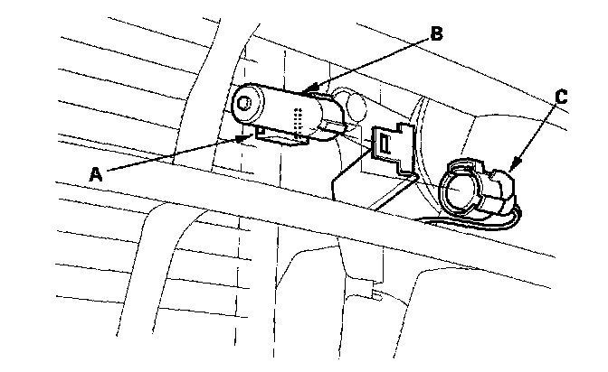 1. Lift the tab (A) to release the lock, and remove the outside air temperature sensor (B), then disconnect the 2P connector (C).