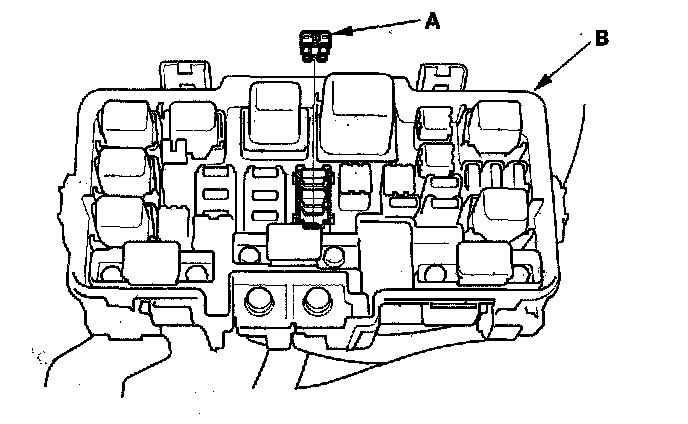2. Remove the No. 9 BACK UP (10 A) fuse (A) from the under-hood fuse/relay box (B) for 60 seconds.