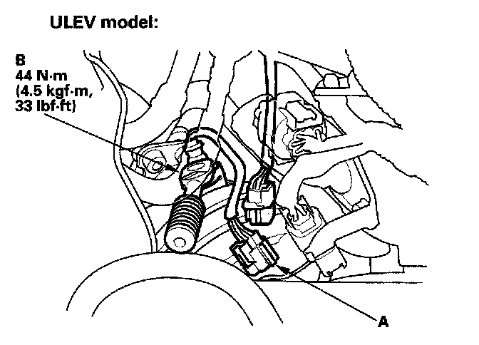 1. Disconnect the secondary HO2S 4P connector (A), then remove the secondary HO2S (B).