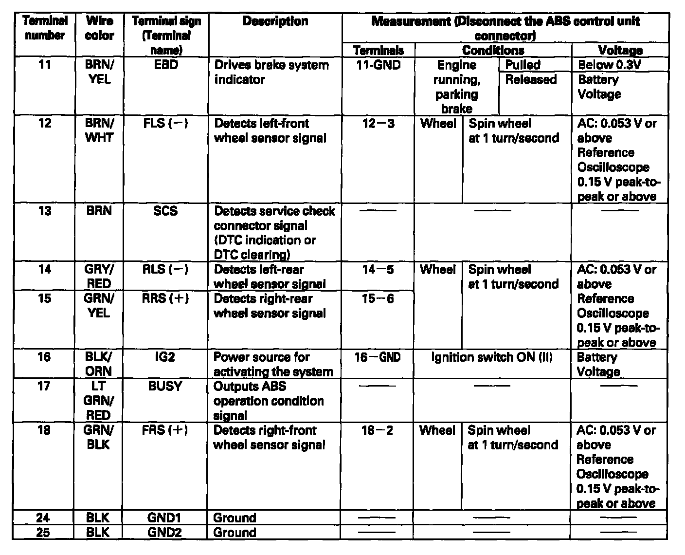 ABS Control Unit Inputs and Outputs for 25P Connector