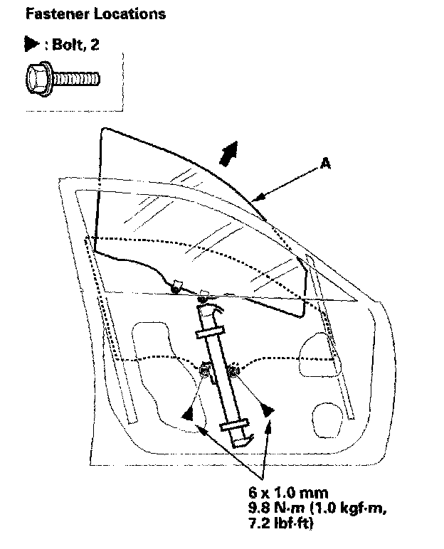 2. Carefully raise the glass (A) until you can see the bolts, then remove them. Carefully pull the glass out through the window slot. Take care not to drop the glass inside the door.