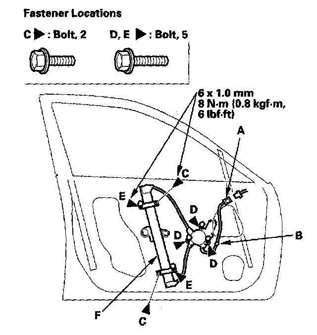 4. Remove the bolts (C), and loosen the bolts (D, E), then remove the regulator (F) through the hole in the door.