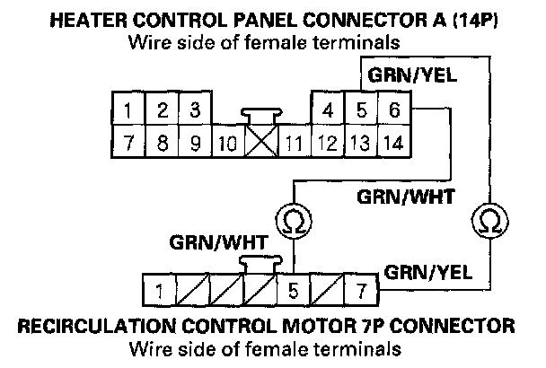 11. Check for continuity between the following terminals of heater control panel connector A (14P) and the recirculation control motor 7P connector.