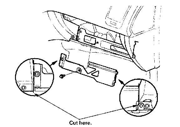 3. Remove the bolt. Cut the plastic cross brace in the glove box opening with diagonal cutters in the area shown, and discard it.
