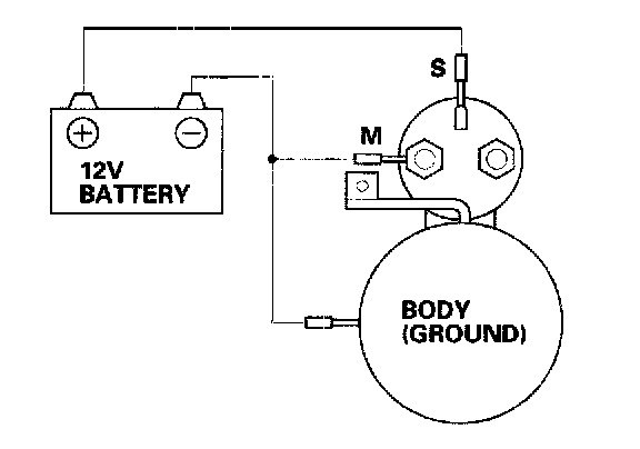 3. Connect the battery as shown. Make sure you disconnect the starter motor wire from the solenoid If the starter pinion moves out, it is working properly.
