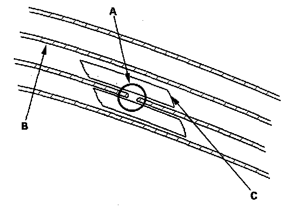 2. Carefully mask above and below the broken portion of the defogger wire (B) with transparent tape (C).