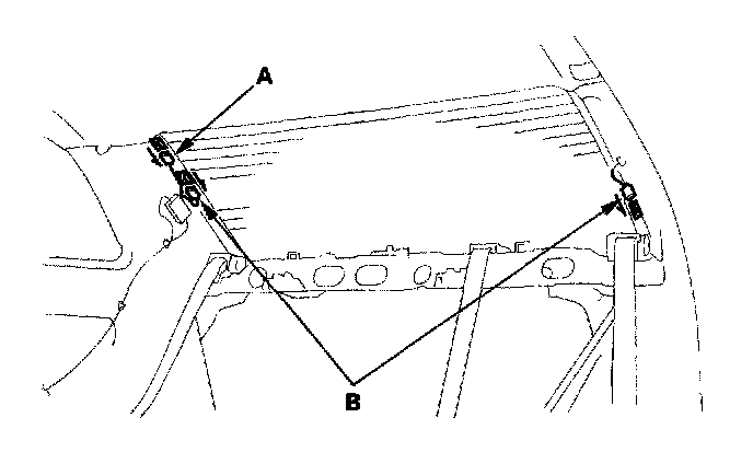 2. Disconnect the window antenna connector (A) and rear window defogger connectors (B).