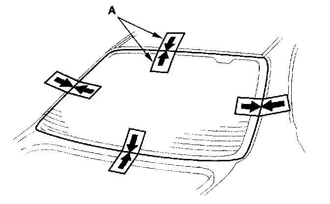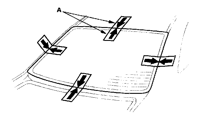 13. Set the rear window in the opening, and center it. Make alignment marks (A) across the rear window and body with a grease pencil at the four points shown. Be careful not to touch the rear window where adhesive will be applied.