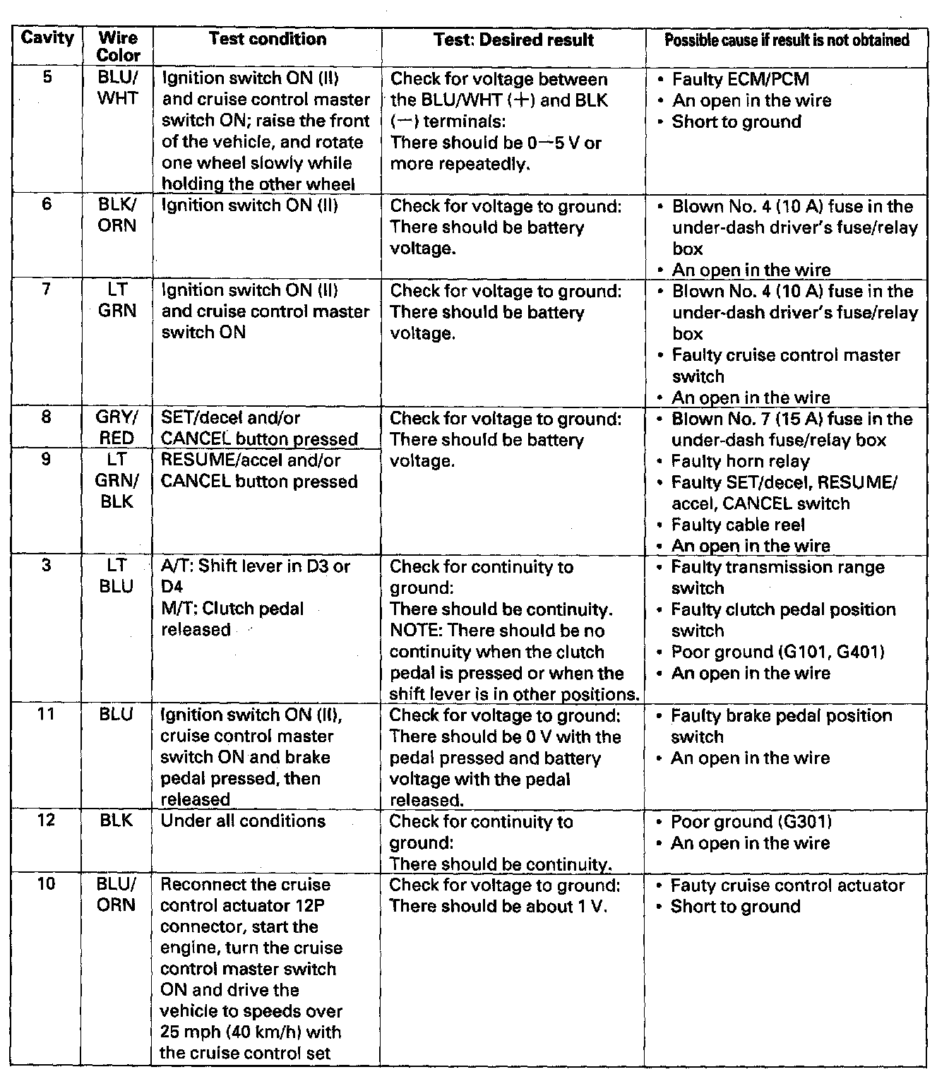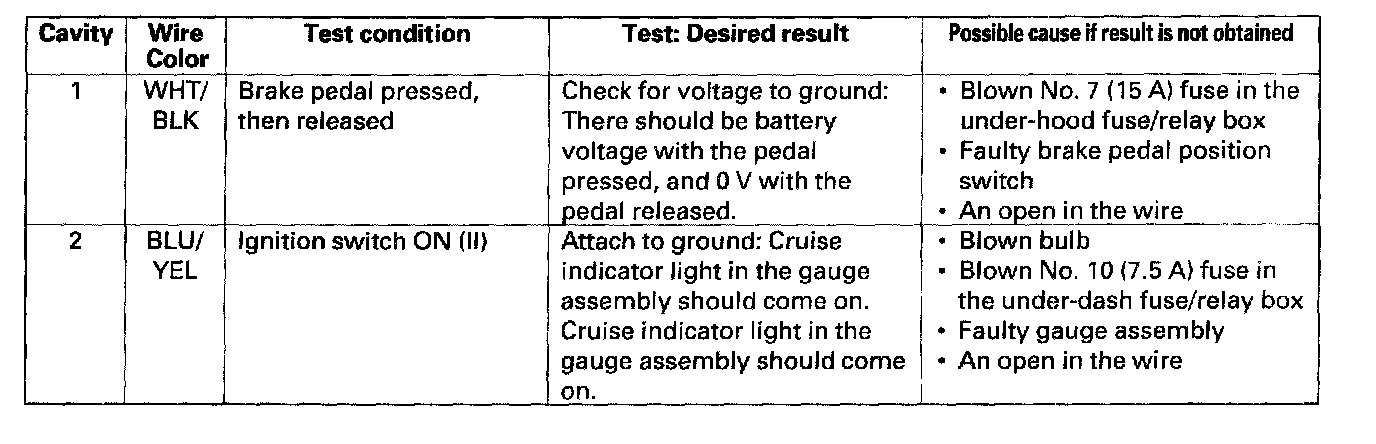 4. If any test indicates a problem, find and correct the cause, then recheck the system. If all the input tests prove OK, the actuator may be faulty. Substitute a known-good cruise control unit and retest. If the system works properly, replace the cruise control actuator.