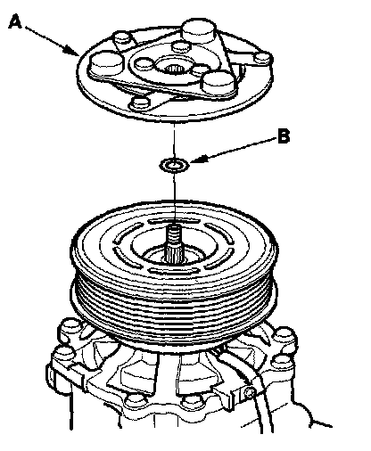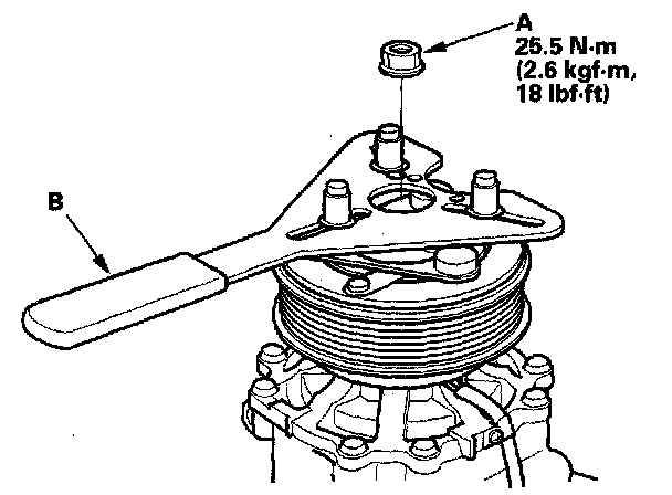 1. Remove the center nut (A) while holding the armature plate with a commercially available A/C clutch holder (B).