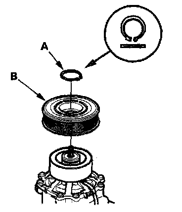 3. If you are replacing the field coil, remove the snap ring (A) with snap ring pliers, then remove the rotor pulley (B). Be careful not to damage the rotor pulley or the compressor.