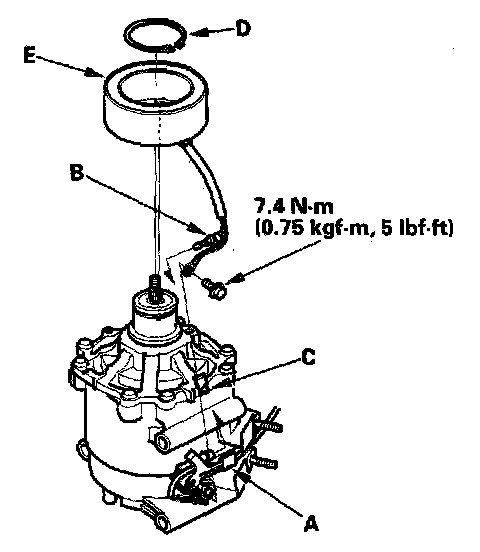 4. Remove the bolt and holder (A), then disconnect the field coil connector (B). Loosen the clamp screw (c) to free the field coil wire. Remove the snap ring (d) with snap ring pliers, then remove the field coil (E). Be careful not to damage the field coil or the compressor.
